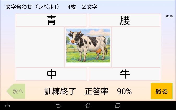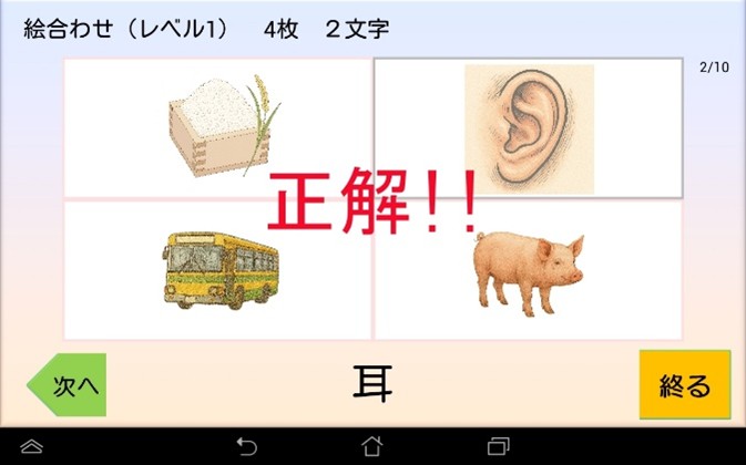 文字表示を「漢字・かな」に変えられ、絵カード表示もレベルに合わせて変えられるので、レベルに合った訓練が出来ます。また、「正解!!」「残念!!」などの判定や、訓練終了後「正答率」が表示されることで、目標をもって訓練することができます。
