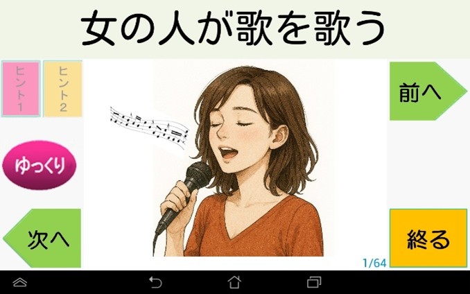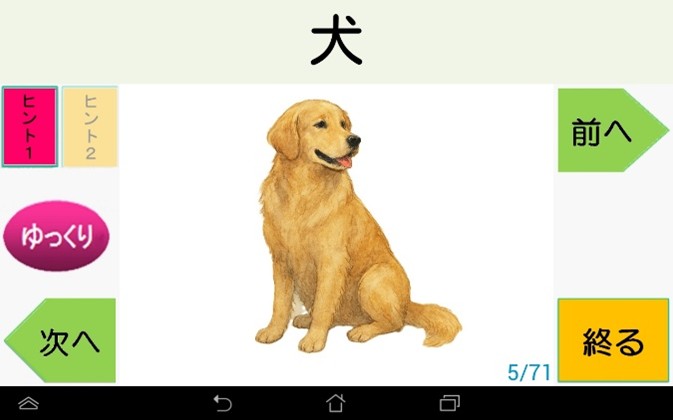 自分で行なえる訓練プログラム 訓練プログラムは、病院の言語訓練と同じように、表示された絵カードを見て名前を言う基本訓練ですが、文字の表示、ヒントの語頭音、名前の音声、発話の録音などの機能の使い方により失語症者ご自身に合わせて訓練が行なえるように作られております。